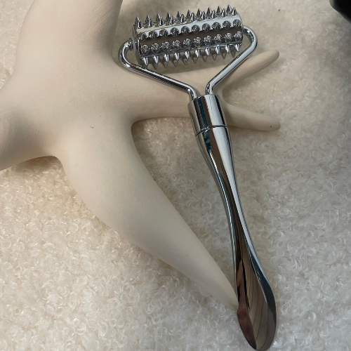 Découvrez notre Ridoki en métal argenté, un outil de massage inspiré des traditions énergétiques asiatiques, conçu pour le travail du corps, la stimulation profonde des tissus et la libération des zones de tension.