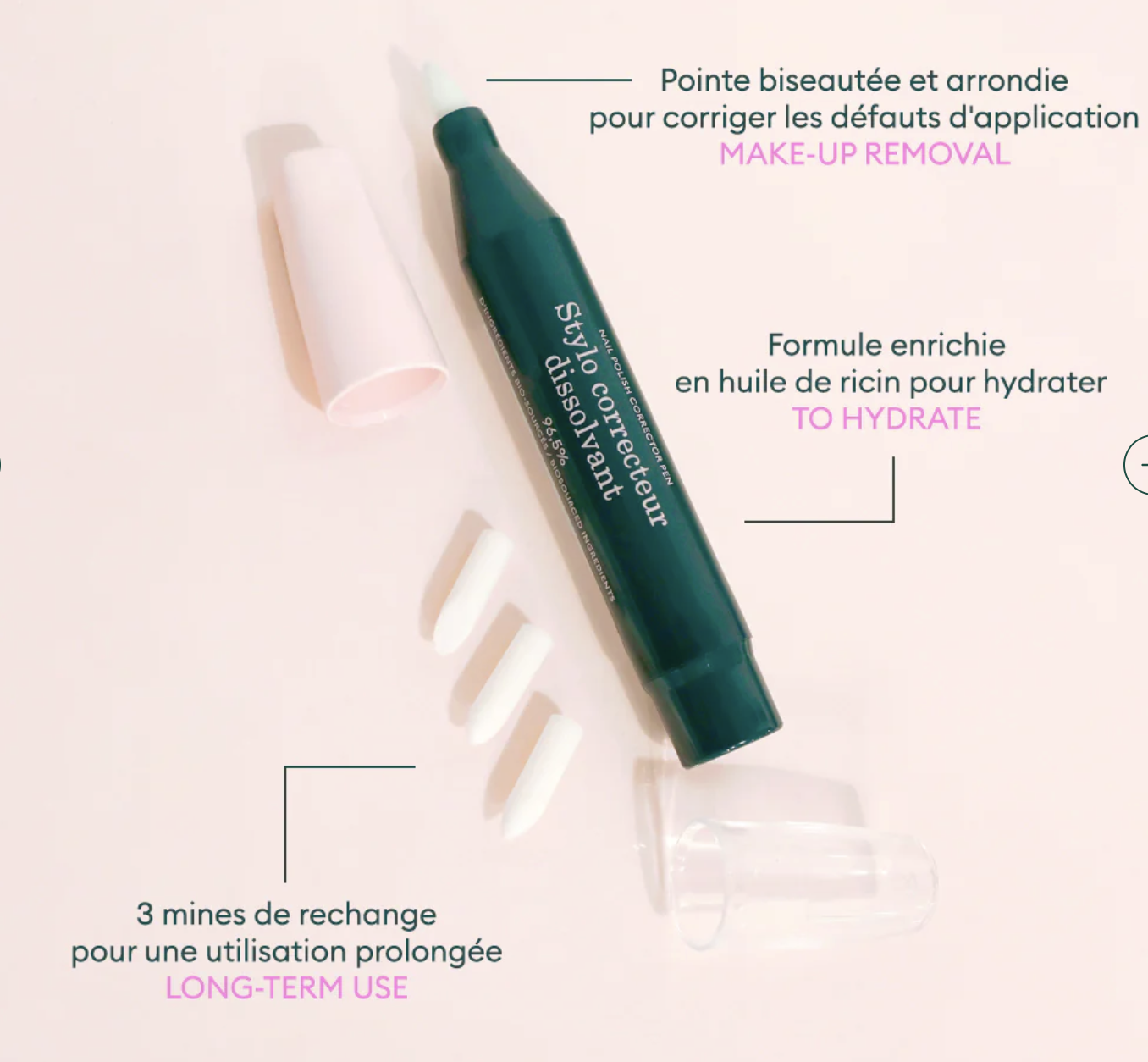 Imbibé de notre dissolvant douxsans acétone, la formule de notre stylo correcteur est bio-sourcée à 97%, et toujours enrichie en huile de ricin pour laisser le contour de l'ongle hydraté. La pointe du stylo est biseauté pour plus de précisions et 3 mines de rechange sont inclus en plus dans notre stylo.