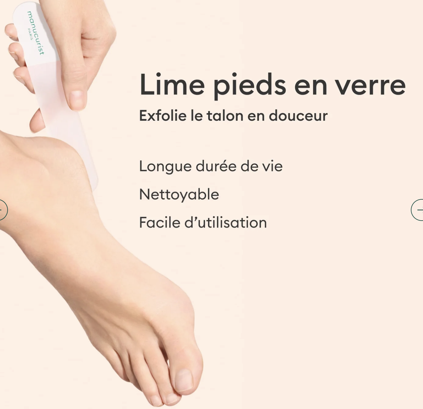 La Lime Pieds Premium en verre, réutilisable à l'infini, pour exfolier le talon en douceur. La peau est douce et lissée, dès la première utilisation.