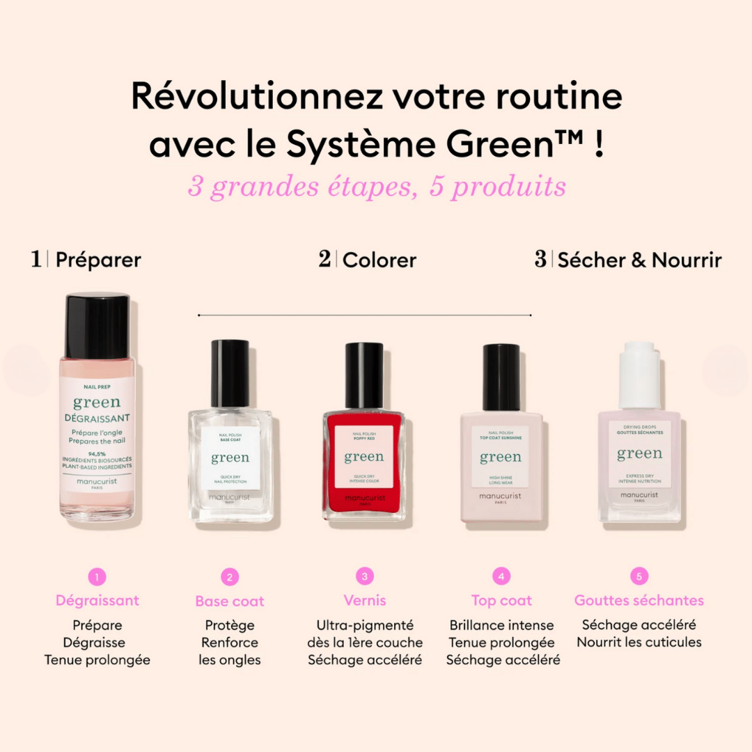 Prolongez la tenue de vos vernis ! Le Dégraissant permet une meilleure adhérence et une tenue prolongée du vernis Green™ : il prépare la surface de l’ongle en éliminant toute trace de corps gras et/ou d’impureté. Sa formule à l’odeur florale est bio-sourcée à 94,5%. Il s’utilise comme un dissolvant avec un coton imbibé de produit pour un ongle parfaitement nettoyé en un seul passage.