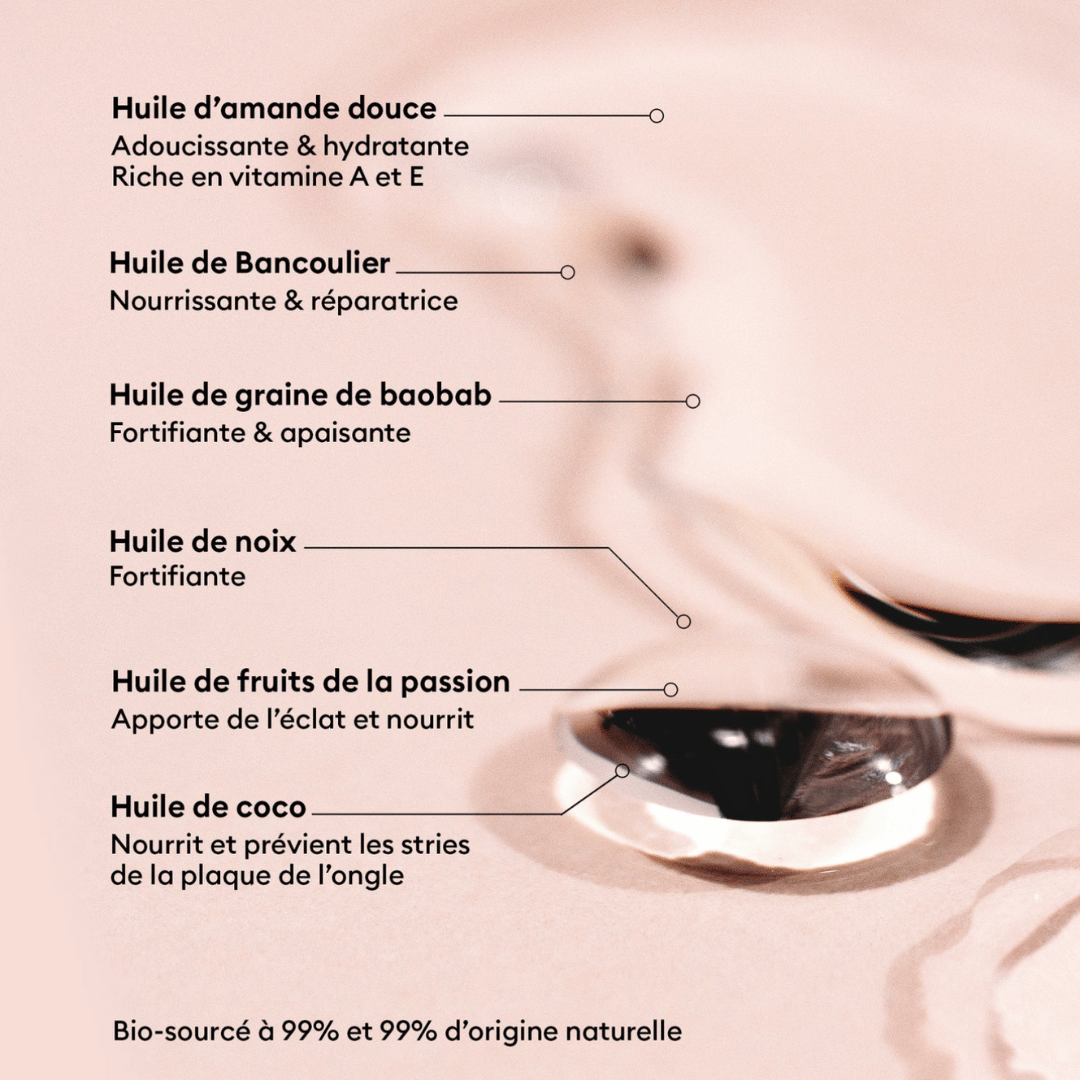 Une huile pour les ongles, vegan, ultra nourrissante, pour prendre soin de ses ongles et cuticules au quotidien. Fini gras non collant. Un mélange de 6 huiles aux actifs multiples pour favoriser la repousse des ongles, avec une formule 99% bio-sourcée : amande douce, fruits de la passion, graines de noyer des Moluques, noix, coco et baobab. Ce soin ultra riche régénère les cuticules, le contour des ongles et les ongles secs. Terminez votre manucure avec l'huile verte en massant le contour de l'ongle et en remontant vers la main pour étaler l'excédent.
