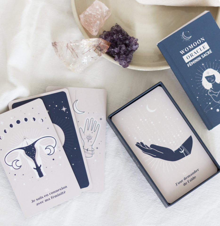 L’oracle Womoon, c’est notre toute première création. Depuis 2019, c’est un jeu de cartes puissant, inspirant et tellement tellement juste qui nous accompagne toutes, dans l’équipe.